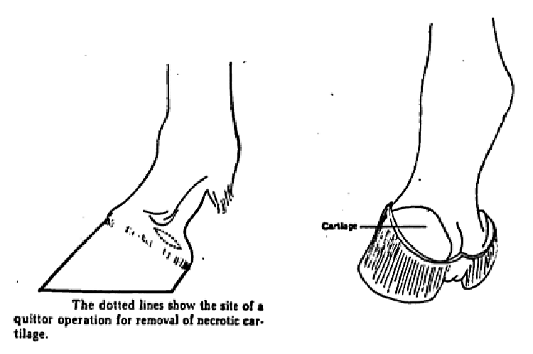A quittor is caused by an infection of the collateral cartilage due to a puncture wound, wire or similar cut or severe bruising to the foot over the area of the collateral cartilage. Bruising may be the result of interfering.